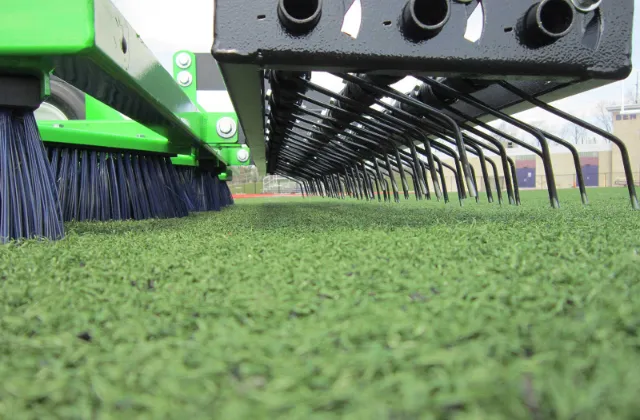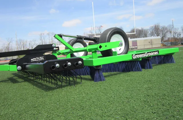 Designed as an attachment to the Synthetic Sports Turf Groomer, the GreensGroomer Spring Tine Rake is an important part of synthetic turf conditioning. Infilled turf systems will compact with use. The Spring Tine Rake moves through the turf profile to lift and decompact the infill. The more frequent a field is used, the more frequent raking and groomer should occur.
